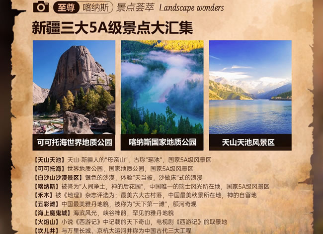 【白沙山沙漠】(贈送,游覽約1小時)白沙山意為銀色的沙漠,只有460米高,高度上在帕米爾高原上確實比較弱,但白沙山長度卻綿延1200米,每當有勁風吹來,白沙山都會發出響聲,故而又被稱作“響沙山”。與白沙山緊鄰的兩個湖泊,水草豐美,水鳥聚集,為這座白色的山峰平添了幾分清新活力。從遠處望去,在遠方的青山和近處綠草的映襯下,白沙山有的像埃及的金字塔,有的像棱角分明的歐式建筑,還有的像一條銀色巨龍靜臥在碧波蕩漾的大海上。銀色的細沙潔白柔和,像嬰兒的肌膚,令人心動,不忍下足。獨家贈送【全地形沖浪車激情體驗】(專業車手駕駛 贈送項目自愿放棄,不做任何退費)隨著車速的增加,沖浪車猶如一艘勇敢的船只,在沙丘之間往返穿梭,留下一道道深深淺淺的車轍,沙丘在車輪下迅速閃過,仿佛一朵朵巨大的浪花在沙漠中翻滾,翻越陡峭的沙丘,穿越沙漠中的障礙 ,給人帶來前所未有的刺激和樂趣,以及征服自然的成就感;【喀納斯景區】(含門票+區間車,游覽時間約2小時)國家AAAAA級旅游景區,位于新疆維吾爾自治區阿勒泰地區布爾津縣北部,有駝頸灣、變色湖、臥龍灣、月亮灣、神仙灣等主要景點;電影[天地英雄]、劉若英-[分開旅行][原來你也在這里]的取景地;【圖瓦人探秘】(贈送,游覽約1小時)進入圖瓦人家木屋,圍坐在一起,品嘗香醇的奶酒、奶酪、民族點心,聆聽圖瓦人特有的民族樂器-蘇爾演奏,婉轉的曲調,悠遠悠長,恍若隔世,伴隨原汁原味的音樂欣賞蒙古族圖瓦人的磅礴舞姿,豪放有力,不禁讓人潸然淚下。
